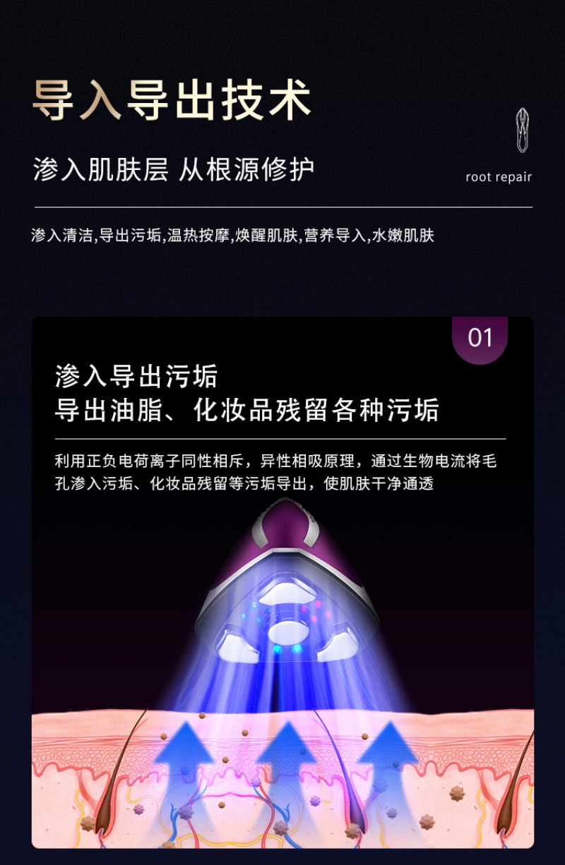 1. Using the principle of positive and negative charged ions repulsion and opposites attract, the pores can penetrate into dirt, cosmetics residue and other dirt through biological current, so that the skin is clean and transparent.