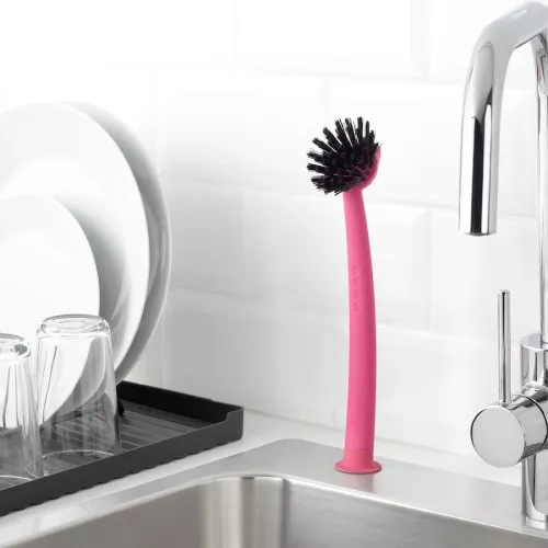 The scraper edge makes it easier to remove stubborn food debris.Sticks to sinks, tiles etc., thanks to the suction cup.