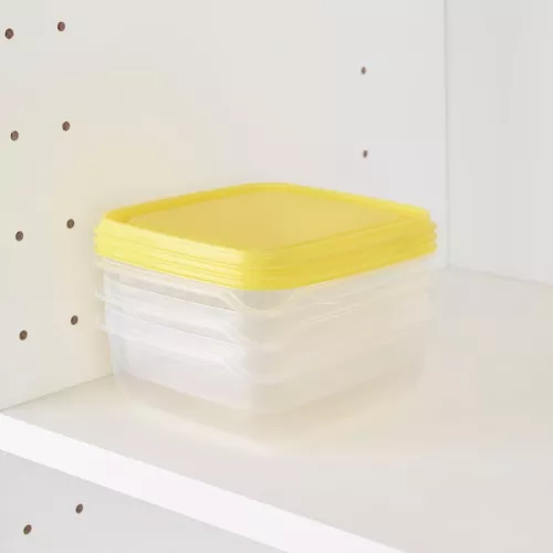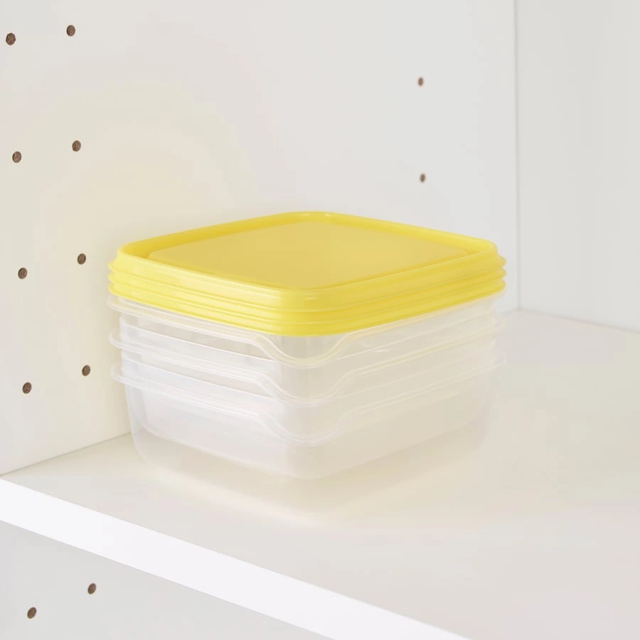 Several food containers can be stacked on top of each other to save space in the fridge and cabinets.