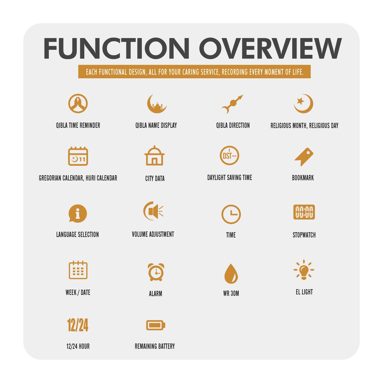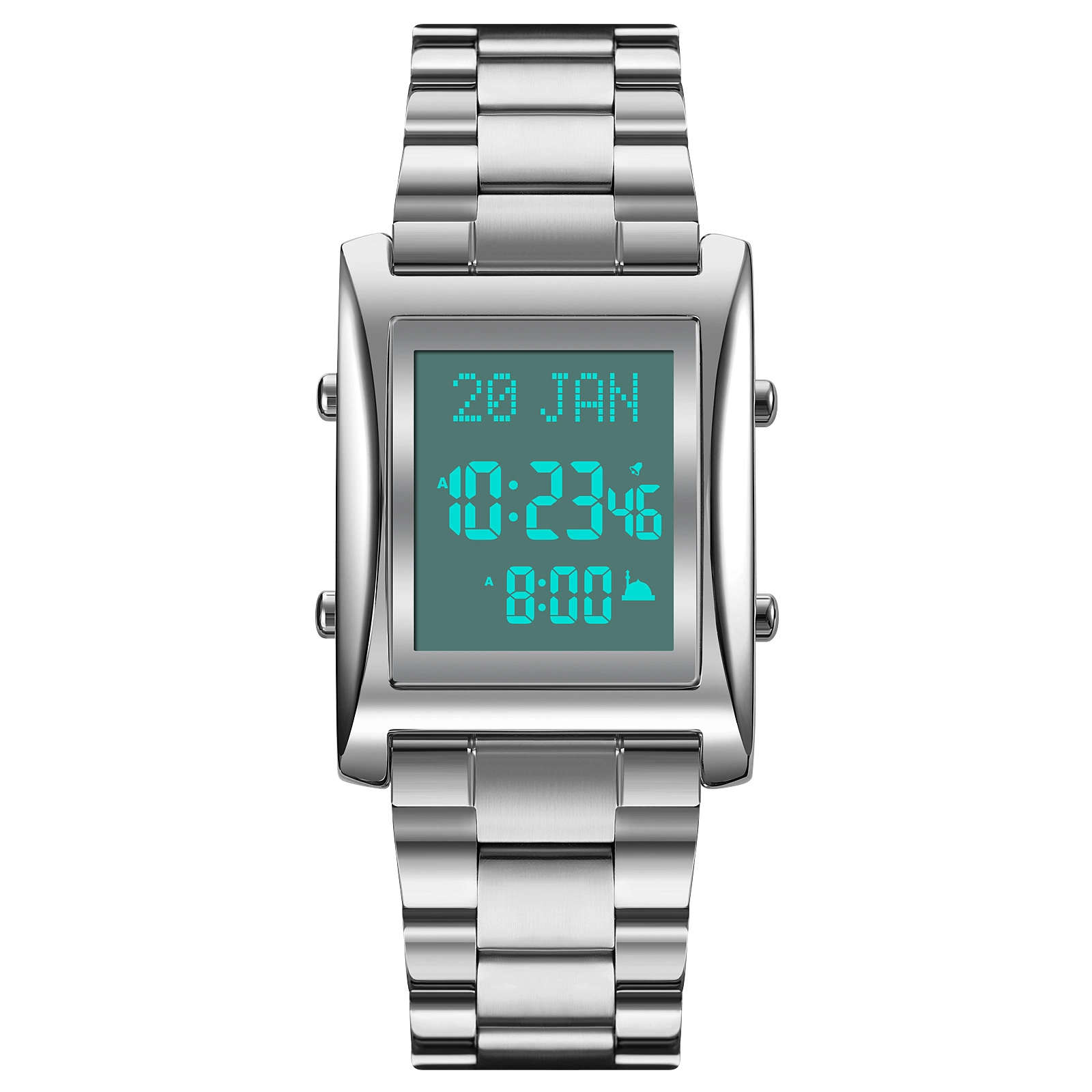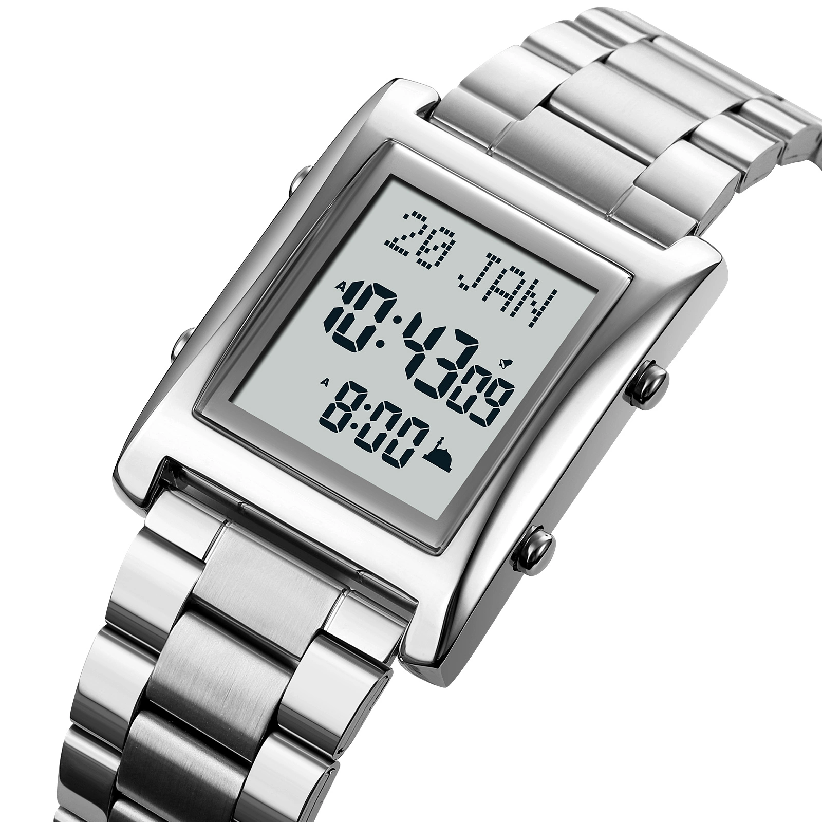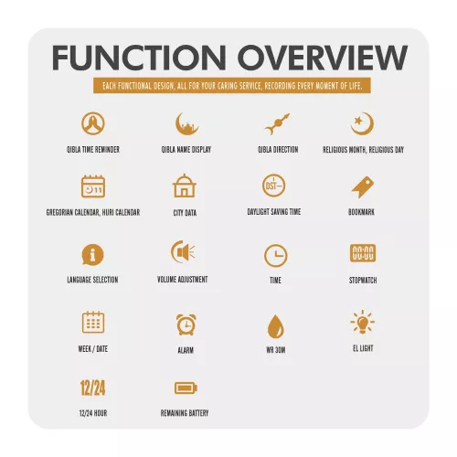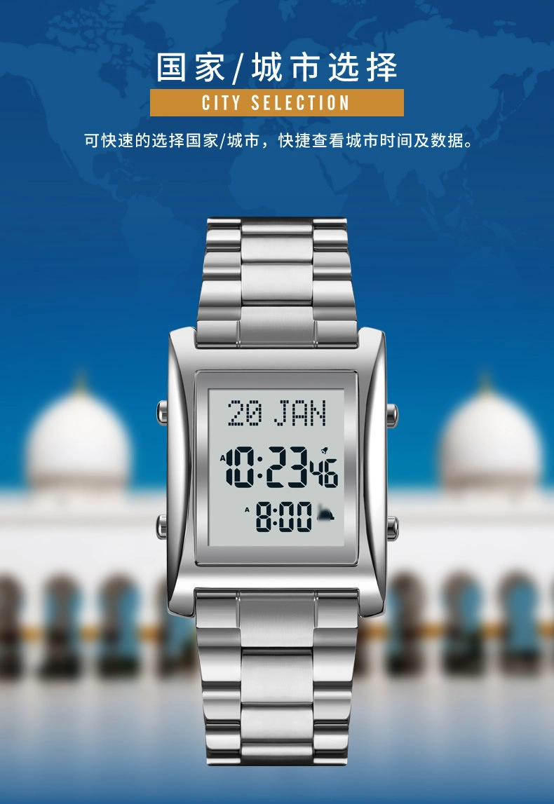 Function: Prayer time reminder, prayer name display, worship direction indication, Gregorian calendar, calendar, city data, daylight saving time function, bookmark function, language selection, volume adjustment, power display time, stopwatch timing, luminous, display date, timer alarm, display week, 12/24 hour system