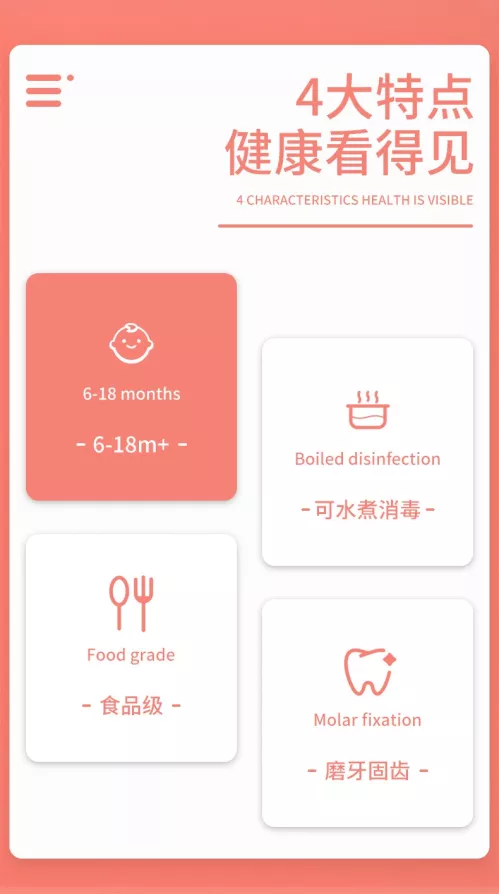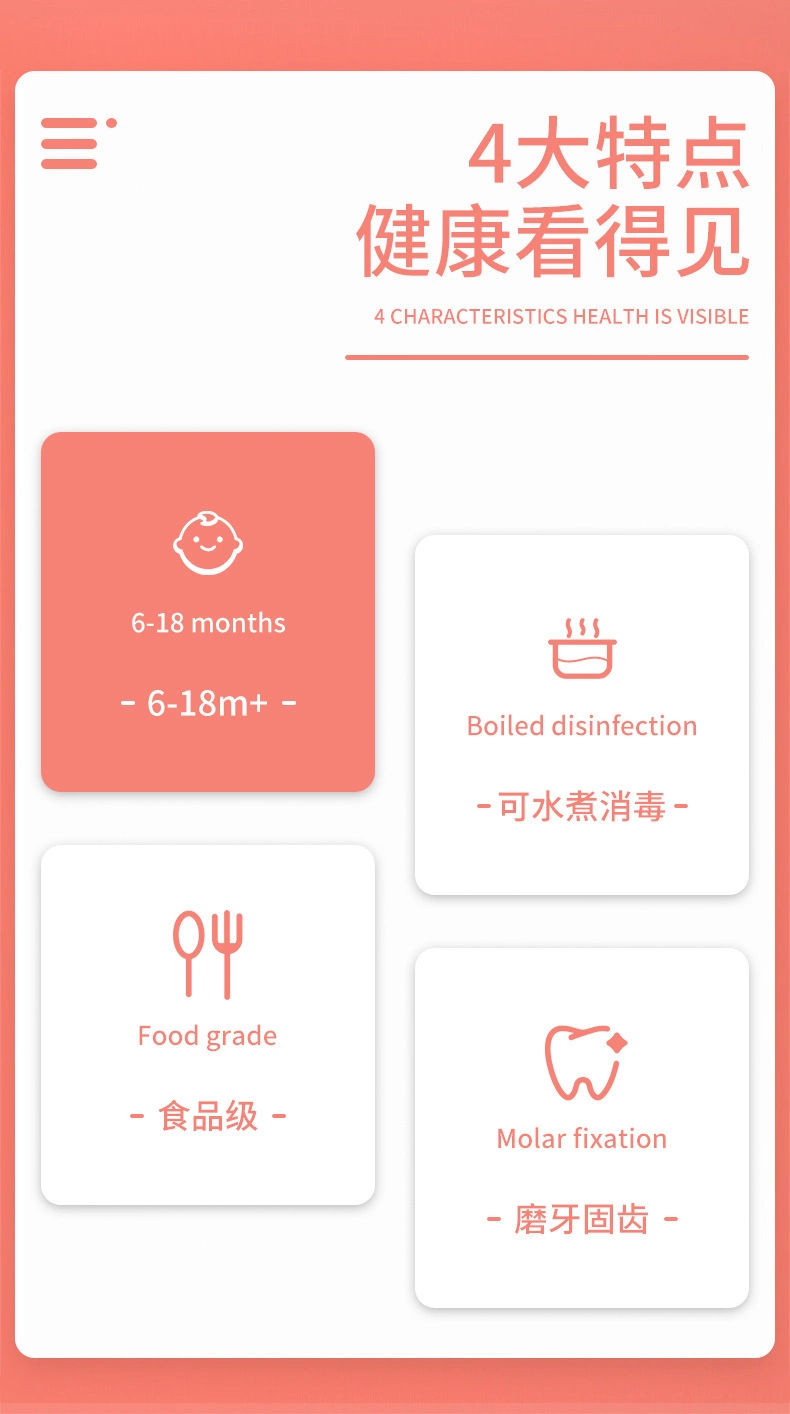The baby licks the spoon and learns to eat the spoon.Designed for baby food beginners. The 28mm diameter ball handle design is more in line with the baby's fist-like "grip grip" grip habit. All silicone integrated molding without fear of high temperature test.