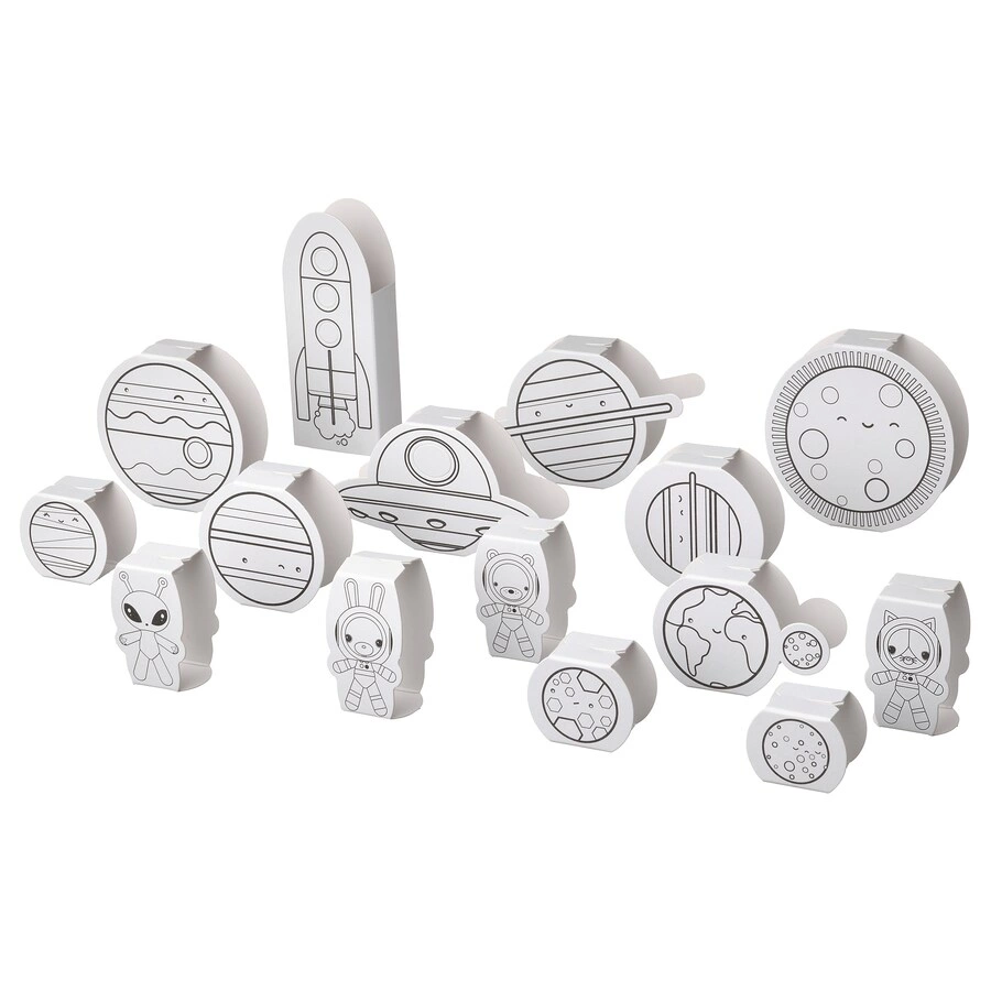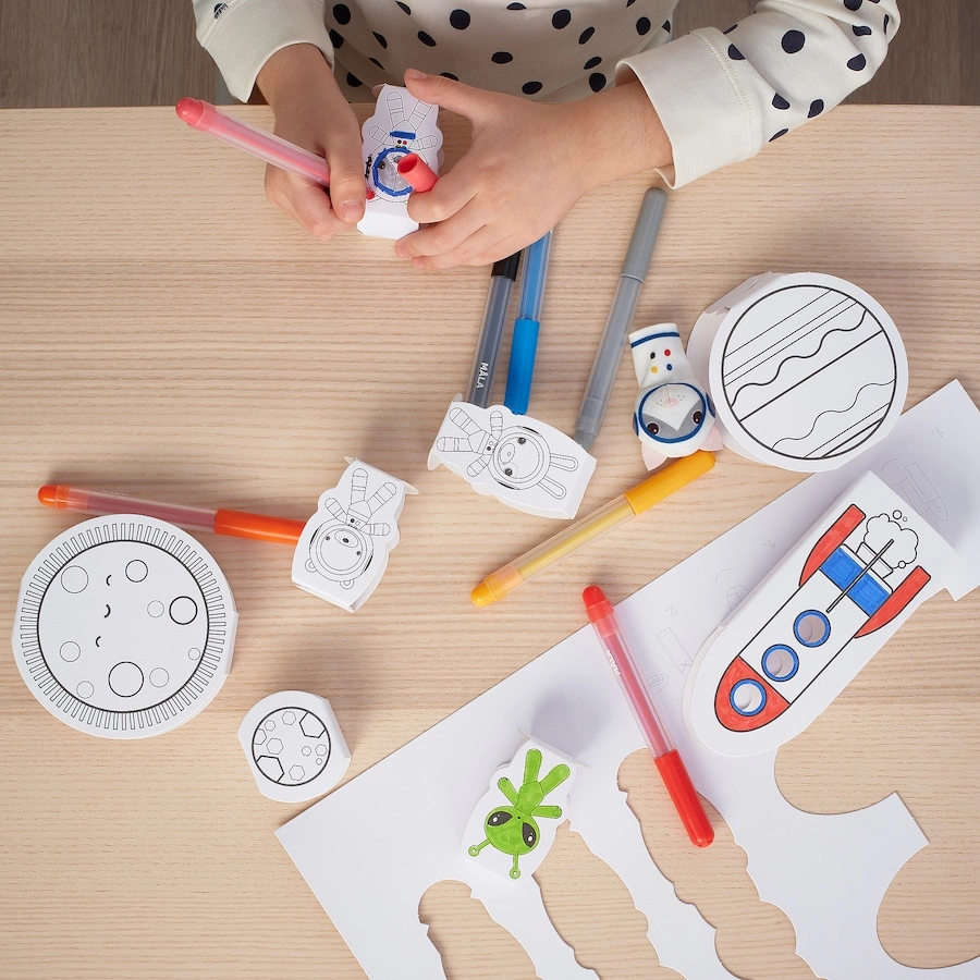 With these cardboard templates, your child can colour, fold and build their own little universe.The newly painted planets, figures and spaceships can also be hung up as decorations.